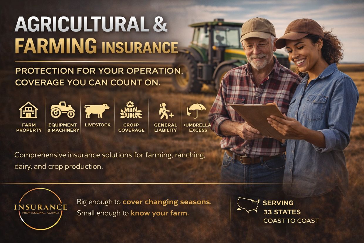 Farming and agricultural operations are built on hard work, long hours, and unpredictable conditions. At Insurance Professional Agency Inc., we help farmers and agricultural businesses protect their land, equipment, livestock, and livelihood with insurance solutions designed for the realities of the industry.